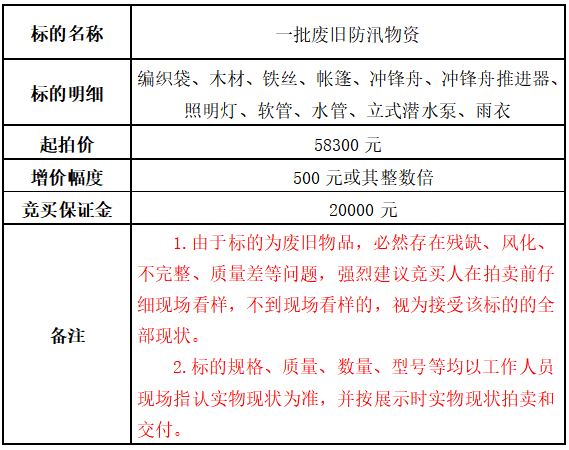 拍卖公告、竞拍须知、拍卖目录以及网拍系统展示的文字、图片等描述仅供竞买人参考,强烈建议竞买人在拍卖前仔细现场看样,不到现场看样的,视为接受该标的的全部现状,竞价成交后,买受人不得以标的不完整、存在质量问题、不能重新使用、数量不准确等问题悔拍或向委托人、拍卖人索偿,请欲报名参与竞价的竞买人充分考虑标的显性和隐性的瑕疵风险以及市场价格的波动,谨慎选择,慎重决定。展示地点:江苏省宿迁市,展示时间:11月18日至19日工作时间提前预约,联系电话:18114268444。