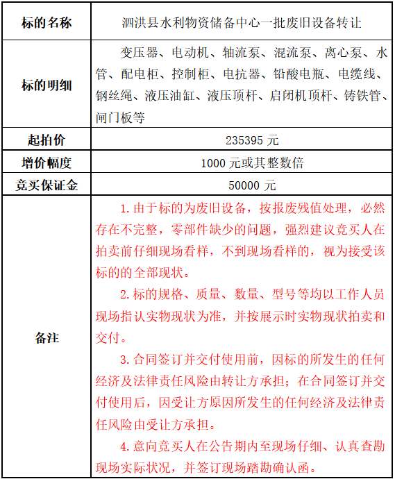 泗洪县水利物资储备中心一批废旧设备转让公告